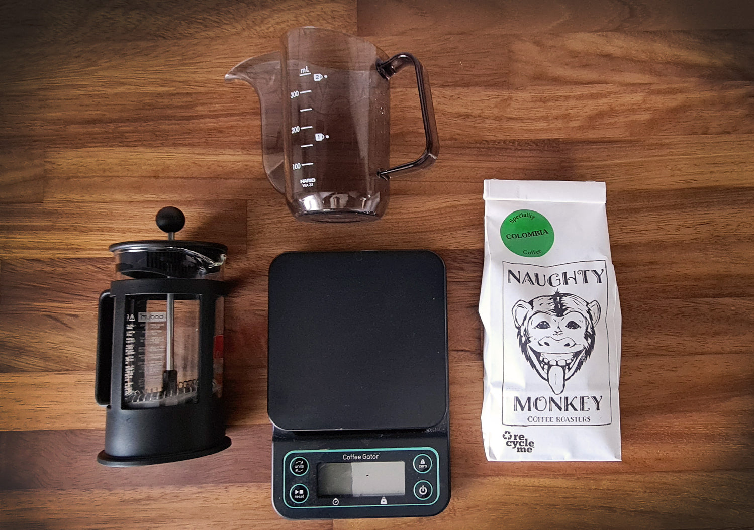 For the coffee/water ratio Hoffman suggests 30g coffee to 500g of water. For the purpose of this guide, I used a smaller Cafetiere and therefore my ratios used were 15g/250g water